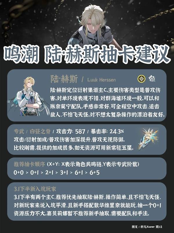 《鸣潮》中陆赫斯已经上线,许多玩家都在纠结要不要抽,下面是由“轩儿Xuaner”为大家带来的《鸣潮》陆赫斯抽取建议,希望能够帮助到大家。