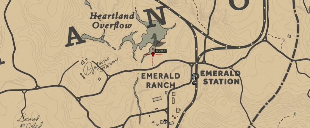 1、我们来到翡翠牧场上方湿地边,如图所示标记的位置。