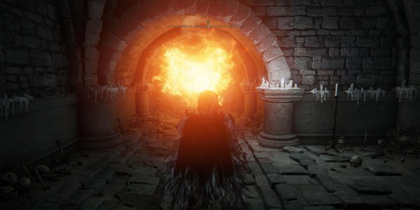 3、如图所示墓室里有各种机关,这种喷火机关可以攻击它改变位置,利用缺口处躲避机关然后到达指定位置攻击,或者是使用魔法或弓箭等远程输出手段直接攻击。