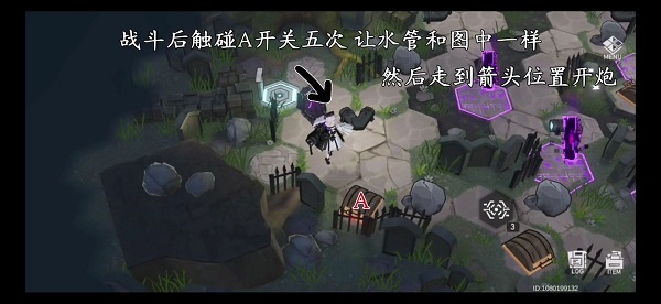 1、首先我们战斗以后先彭A开关5次,使水管与图中的一样,再走到箭头位置开炮。