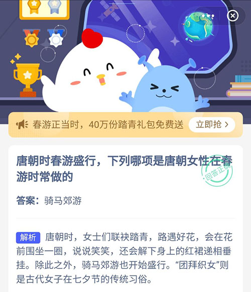 唐朝时春游盛行下列哪项是唐朝女性在春游时常做的 支付宝蚂蚁庄园3月19日答案