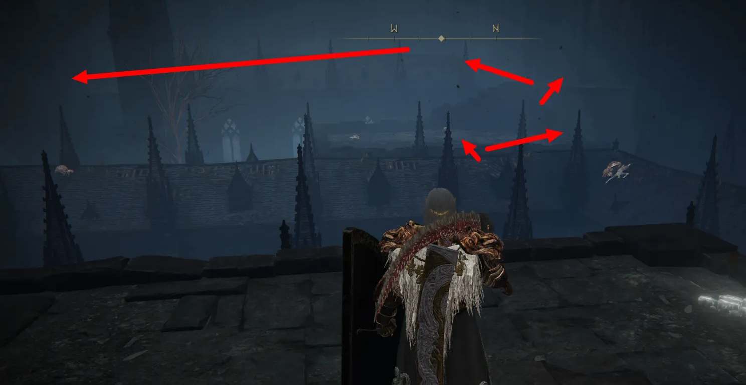 4、来到下图的平台上,跳到前面的屋顶,击败火焰骑士后,从旁边斜坡上去,找到缺口跳下去就恶意找到祈祷厅的门。