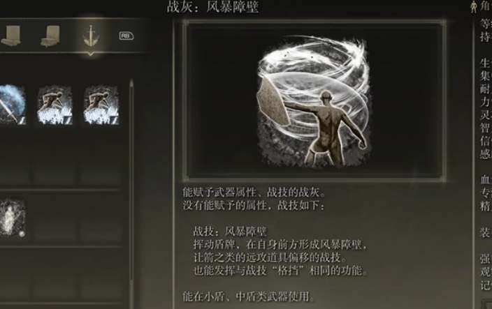 3、风暴障壁:如果敌人有远程攻击的话就可以携带这个战灰,可以很好的避免伤害。