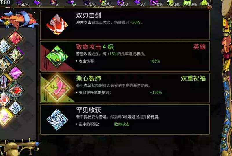 3、矛1:波塞冬信物,拿普攻再冲刺、海上风暴双祝福,有水神就拿崩裂,击退到障碍物加伤害,有雷神就拿落雷范围,双重雷击。