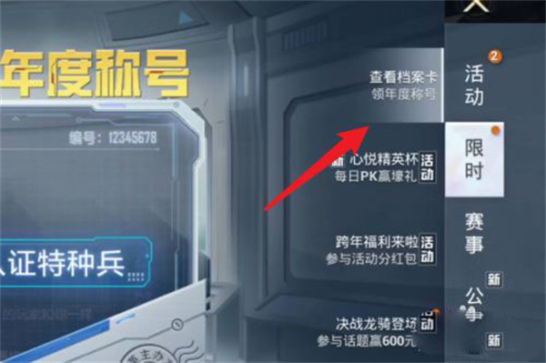 和平精英年底新增了一个年度认证特种兵称号,看起来十分炫酷,那么年度认证特种兵称号怎么获得呢?下面小编就向大家介绍下年度认证特种兵称号的获取方式,跟着下文的步骤操作就可以拿到手了。