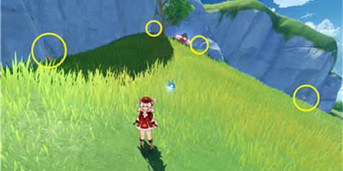 3、鹤翼宝藏位于归离原南边,需点燃四个火炬开箱子,火炬位置如图,第二个把宝箱后面的石头打碎就能看到;