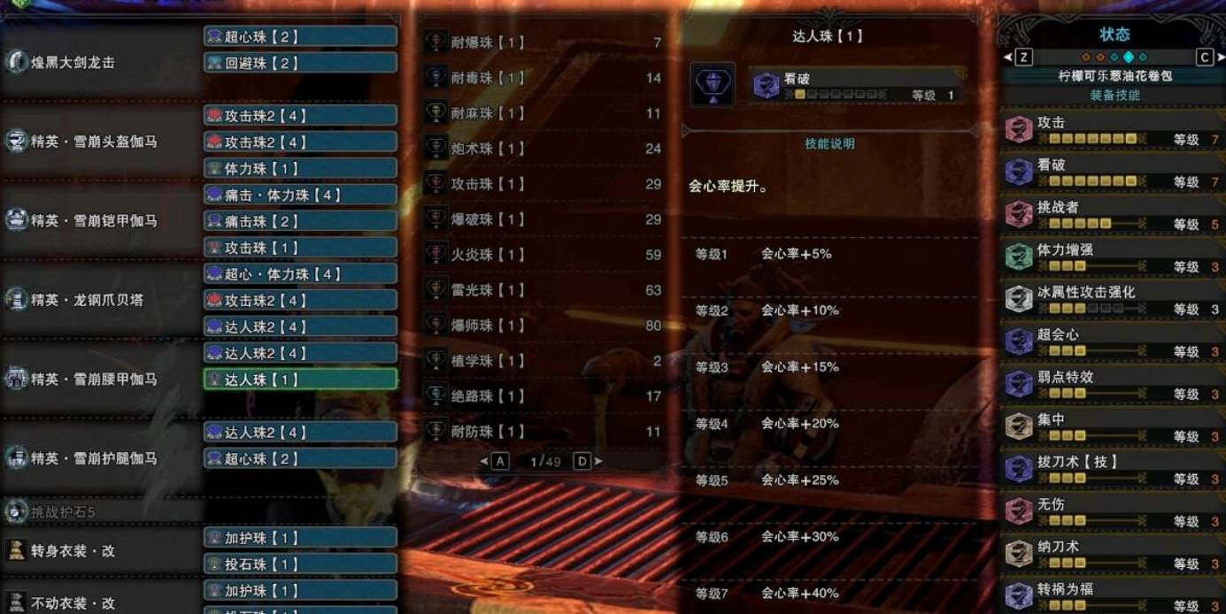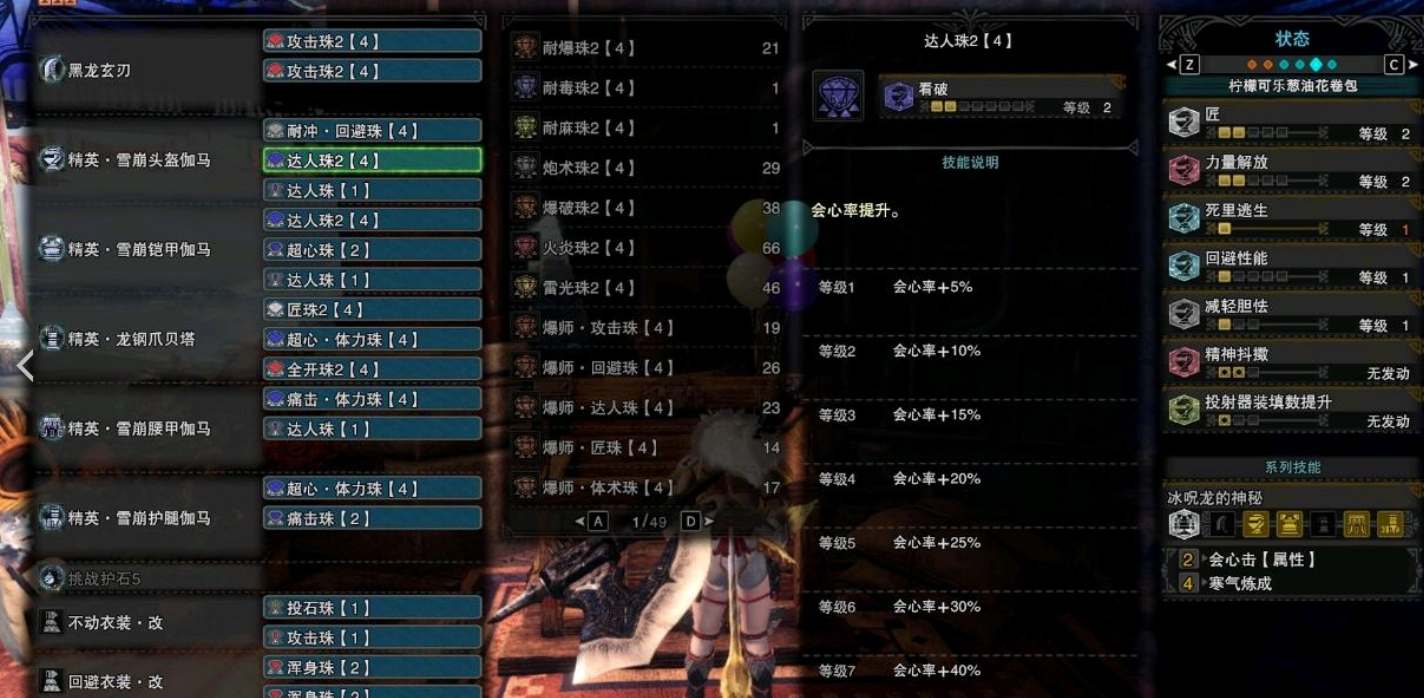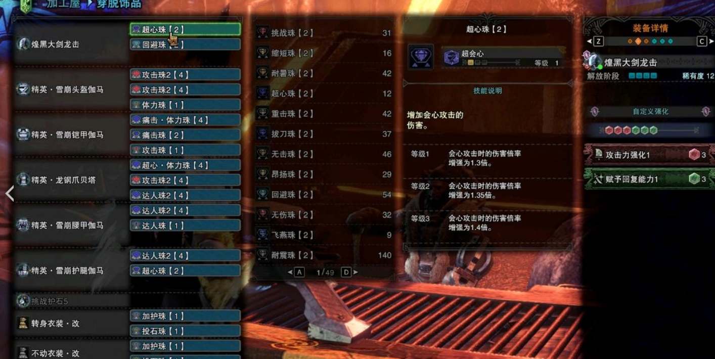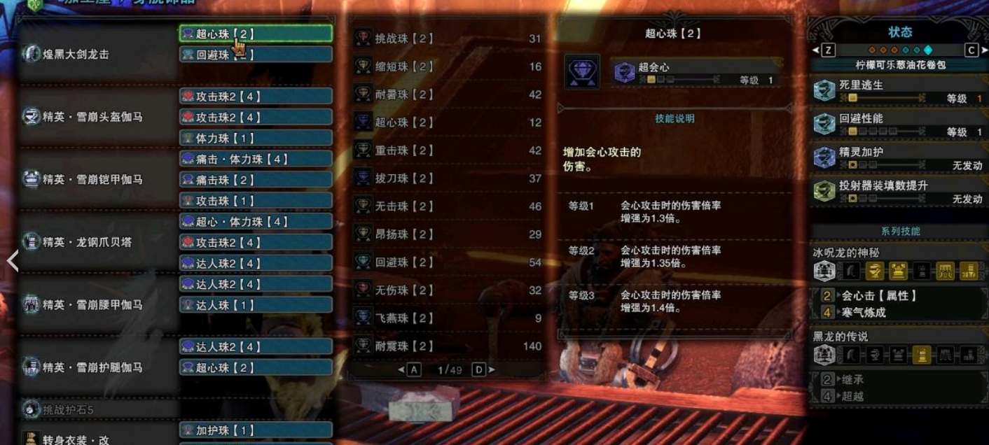 这套配装适用于联机,常驻会心75。如果单人黑龙可以考虑超心体力→超心回避,耐冲回避→攻击4/力解4/炮手2。