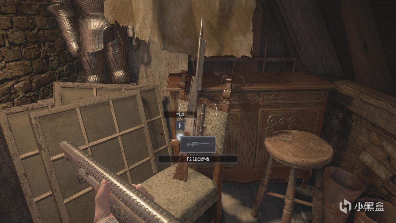 在蒂米特雷斯库城堡房间,解完任务之后,出门,即可看见一把椅子上靠着枪。