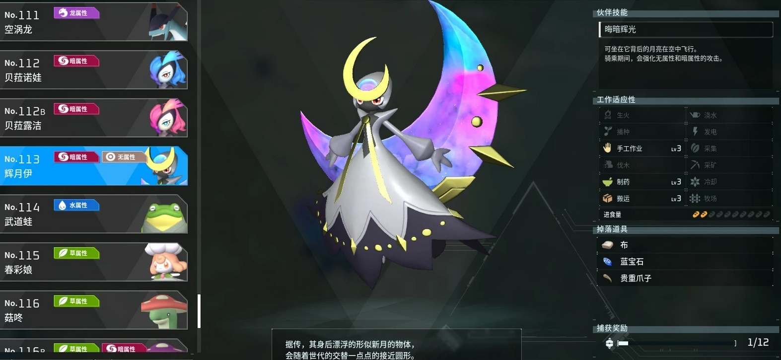 4、辉月伊的属性、工作适应性以及种族值可以参考下图所示。这个帕鲁捕获后还可以解锁鞍具当做坐骑使用。