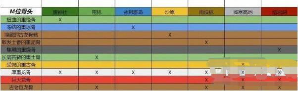 M位骨头有:扭曲的重怪骨、冻结的重冰骨、埋藏的古龙骨骸、散发土香的重泥骨、焦黑的重烧骨、长满苔藓的重土骨、受损的重古骨、厚重龙骨、巨大龙骨、古老巨龙骨