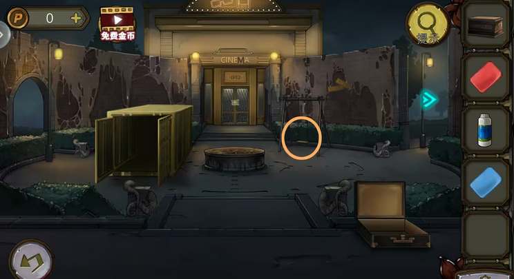 49、箱子上的图案对应影院周边上的数字,打开箱子拿到圆锯片。密码:9426