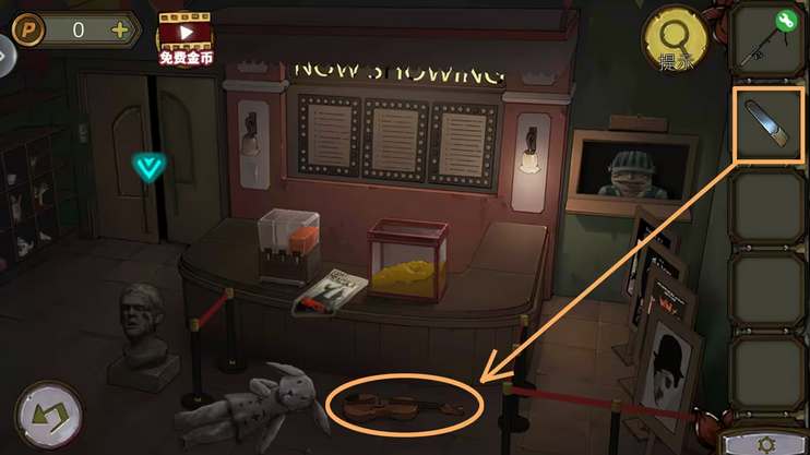 39、和坐在观影席的“小别致”对话,“小别致”要爆米花和饮料。在木船的箱子拿到开琴器,打开影院的小提琴拿到红宝石。