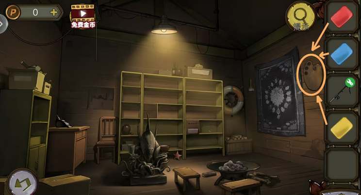 27、结合桌上纸条和轮船上的方格,打开右边柜子拿到鱼线。密码:SOFA