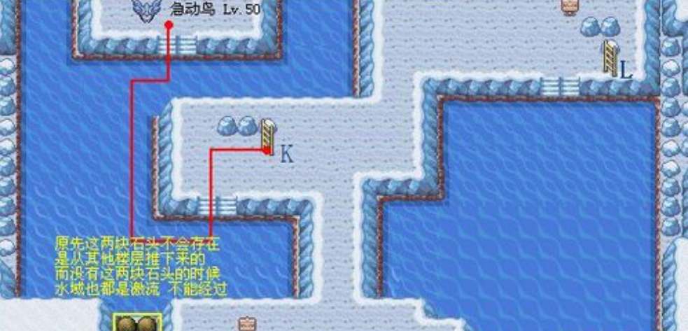 5、把两个石头从上面一层推下来后会挡住这里的水流,水面变得平静,此时从楼梯下来,就可以在水边使用冲浪术去找急冻鸟了。