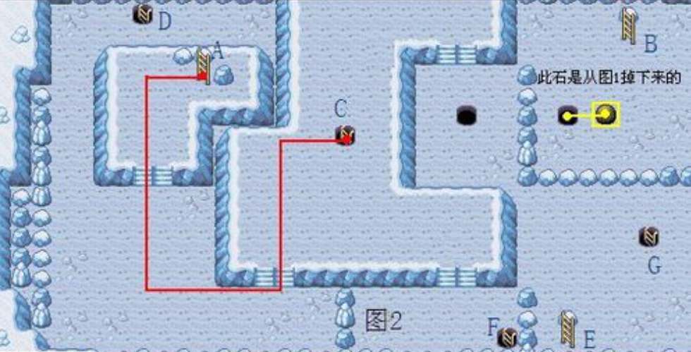 3、把右侧的石头继续推导洞口掉落到下一层,然后按照红色路线前往下层。