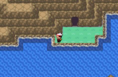 2、往下走,来到水边使用冲浪术,绕到山的下方找到山洞入口进入火山。