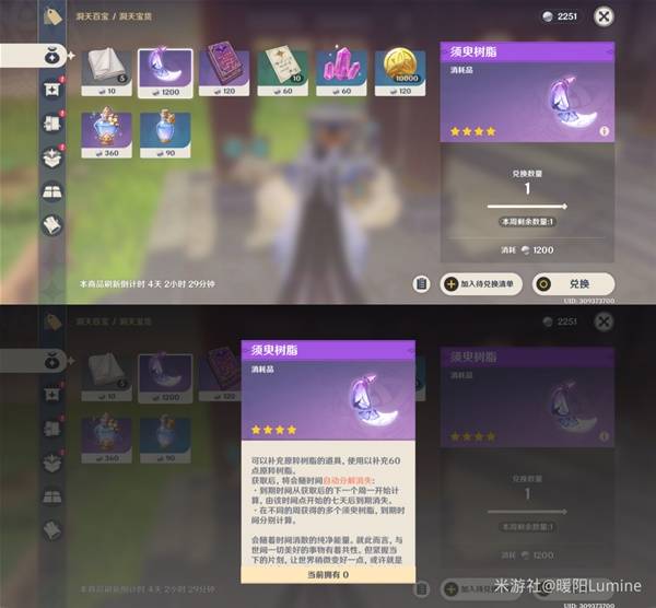 然后是尘歌壶兑换须臾树脂啦,2.28剧诗星章奖励领取的和3.1尘歌壶兑换的均在3.9过期,只要在3.4号当天使用就好。3.1-3.8的尘歌壶兑换的建议到了3.4再去兑换,不然不小心使用了就少计入60原粹树脂了。3.9-3.14还可以兑换1个,本次最多能用到5个须臾树脂。