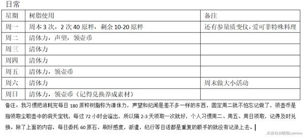 日常清体力的表格每个玩家账号情况不同,所以体力消耗都不同,我个人会优先保证能打满月谕模式,日常大部分的体力都用来打地脉花领摩拉和经验书。