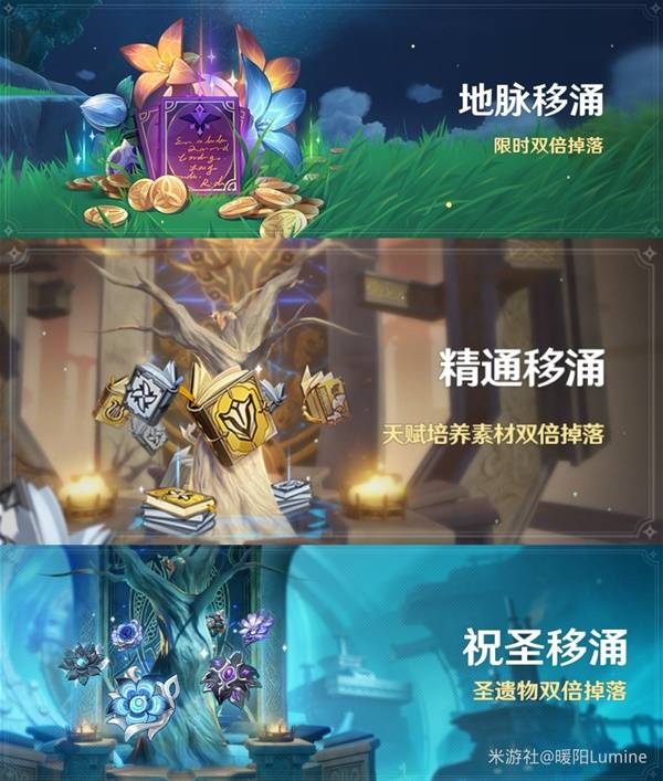 版本最后一周的限时双倍掉落活动(3种种移涌),每日定向送的双倍掉落,60原粹树脂优先用完,其他的结合自己的需要去使用,我一般是刷地脉花攒摩拉和经验书给新版本抽的角色用。