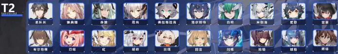 T2:总队长、雅典娜、赤狼、霞光、佛拉格拉克、塔尔博特、白蛉、米伽洛、星椋、雷暴、迦耶伯格、布尔特根、刃碟、虹、胡峰、日珥、回音、闪蝶、钨铬、赋格、辉砾、枪棘。