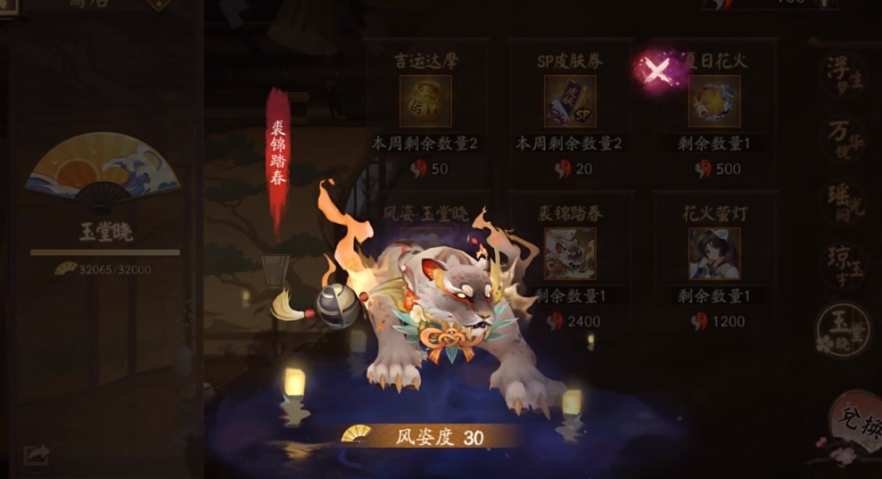 2、可在风姿商店内兑换黑豹·裘锦踏春御灵皮肤、吉运达摩、全新动态头像框「风姿·玉堂晓」、动态头像框「夏日花火」以及白童子皮肤·花火萤灯等奖励。