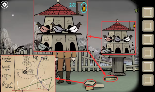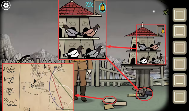 按图摆放鸽子点击两次铃铛,鸽子带回D点的零件
