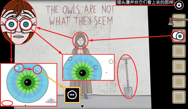 6、到树林进入房屋,拿走铲子,把羊眼睛给妹妹,从左眼可以看到萤火虫的位置