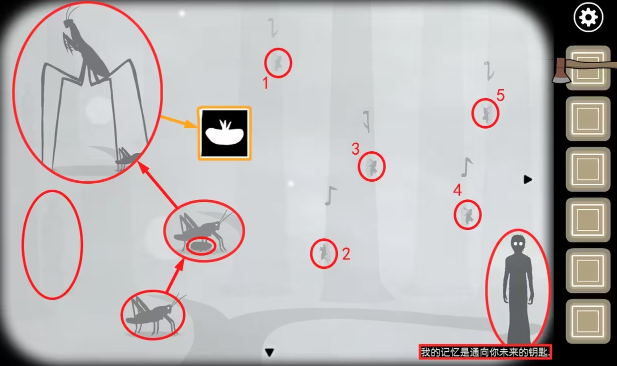 11、将萤火虫喂给猫头鹰,然后多次点击猫头鹰,巨大蝗虫会出现破坏树木,多次点击断开的树枝会掉落钥匙,拿走