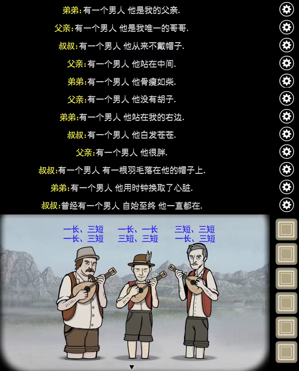 1、调查左边的3人,从中间的弟弟开始,依次点击歌词中描述的下一个人,顺序为:中右左右中右中左右左中左中