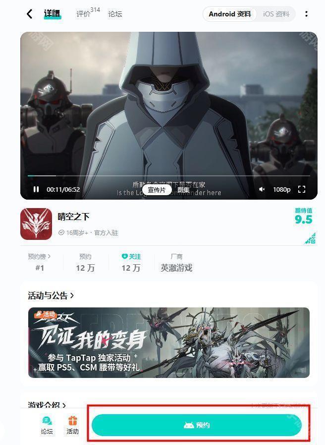 3、TapTap直接在游戏详情页面点击下方【预约】按钮即可