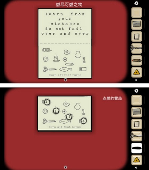答:根据单词提示烧穿对应的东西,第一次是烧掉可以燃烧的物品符号,第二次是烧穿有生命的物品符号,第三次是烧穿颜色为红色的物品符号