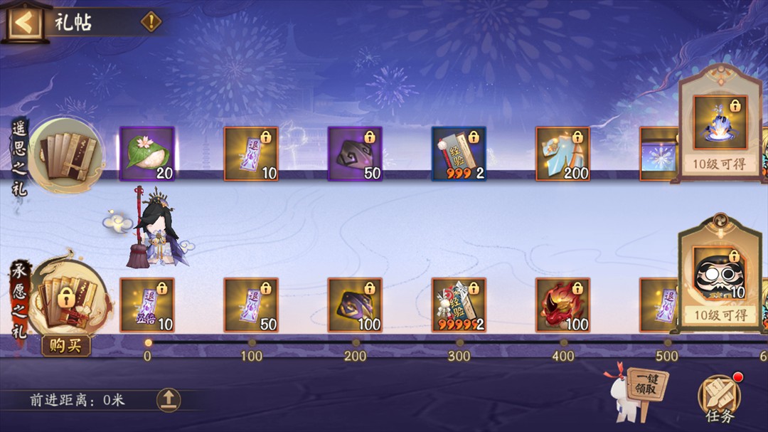 完成活动内每日任务与成就可获得「礼帖经验」,提升前进距离获得「夏日庆典」专属名染和点触等奖励。阴阳师也可购买「承愿之礼」解锁「御行达摩碎片」、「五星奉为达摩」等更多奖励。
