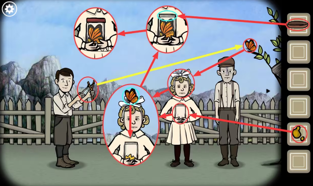 点击塞缪尔手中的弹弓,再点击树枝上的蝴蝶,蝴蝶会飞走落在艾玛头上
