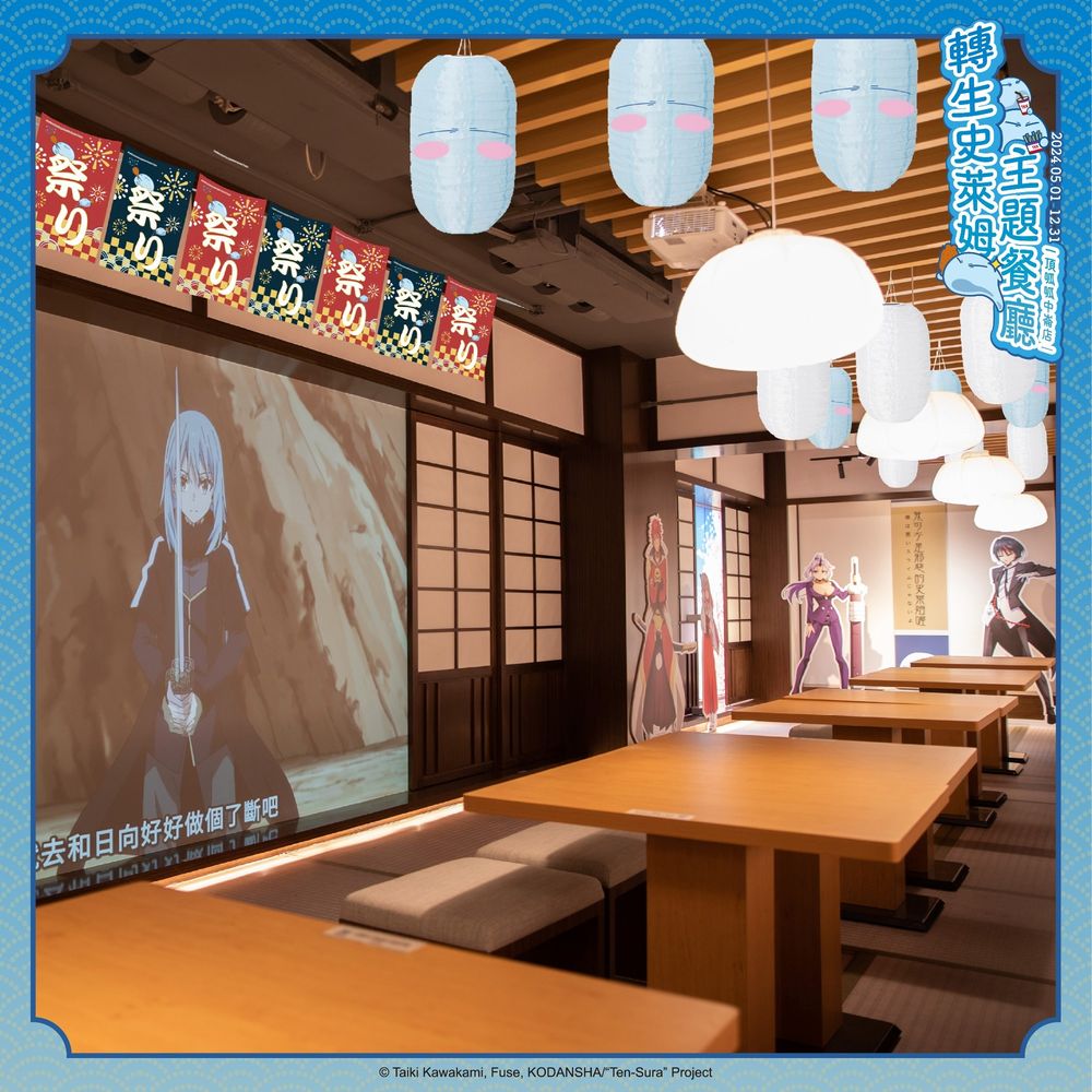 为了提升沉浸感,本次店内装潢以祭典风格为主题,二楼用餐区新增祭典挂轴装饰及利姆路造型灯笼,让每位到访者仿佛置身动画世界。此外,店内新增的联名专属压币机,提供四款角色纪念币供粉丝收藏,除了有美味餐点,更还有众多独家商品等着来蒐藏,快揪史莱姆粉丝们一同出发体验《关于我转生变成史莱姆这档事》的独家魅力吧!